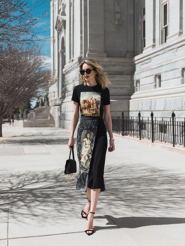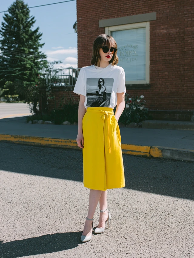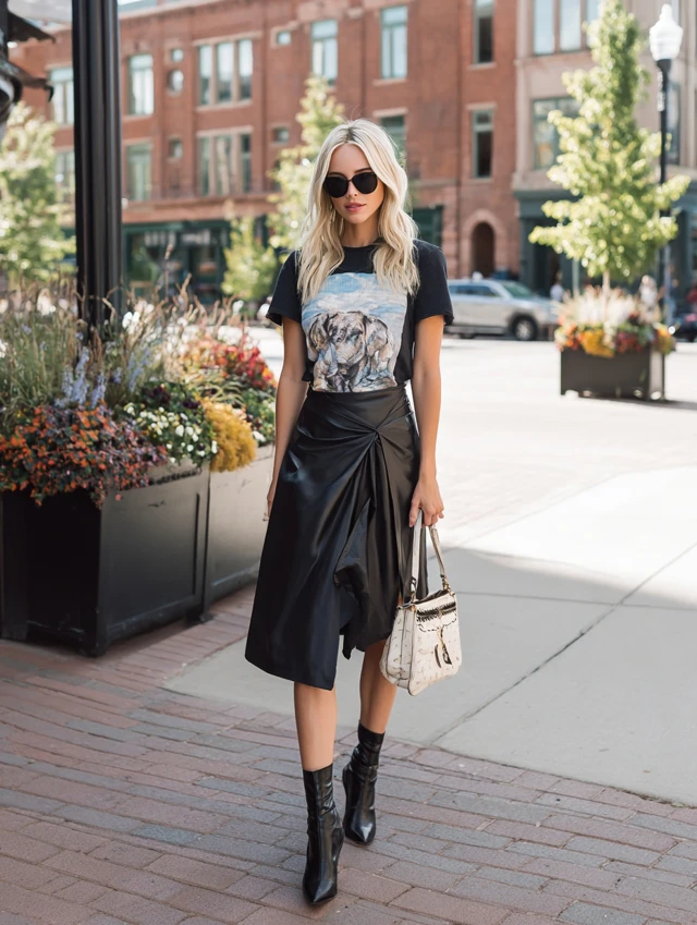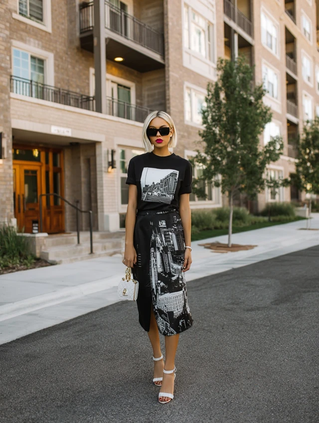 Why It Works: Feminine meets laid-back cool. A midi skirt adds elegance, while the tee keeps it casual.