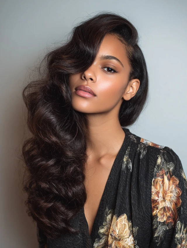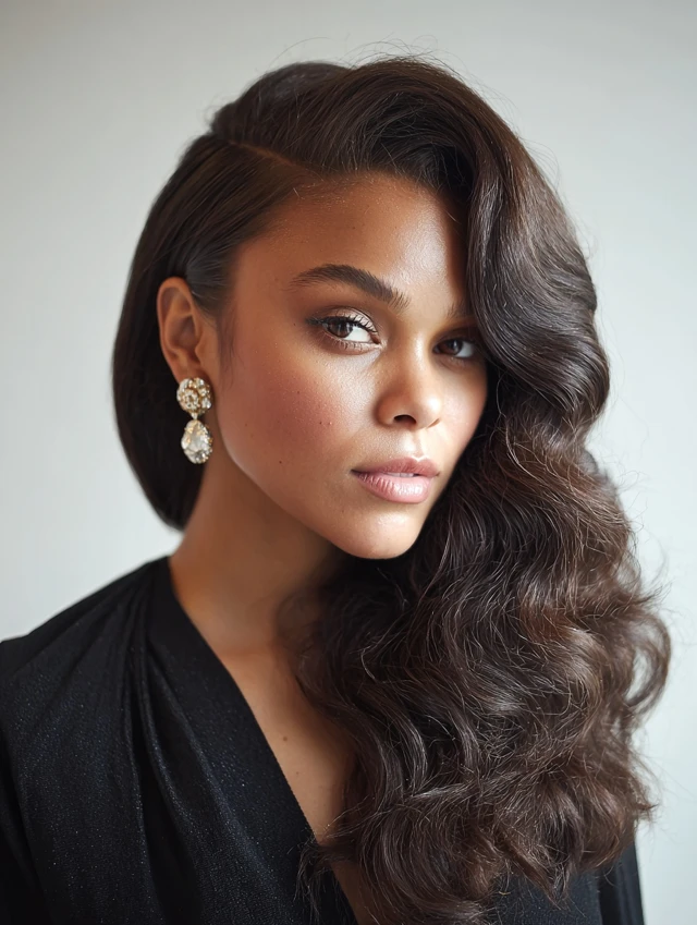 Sweeping the waves to one side adds softness and enhances volume for a romantic, elegant finish.