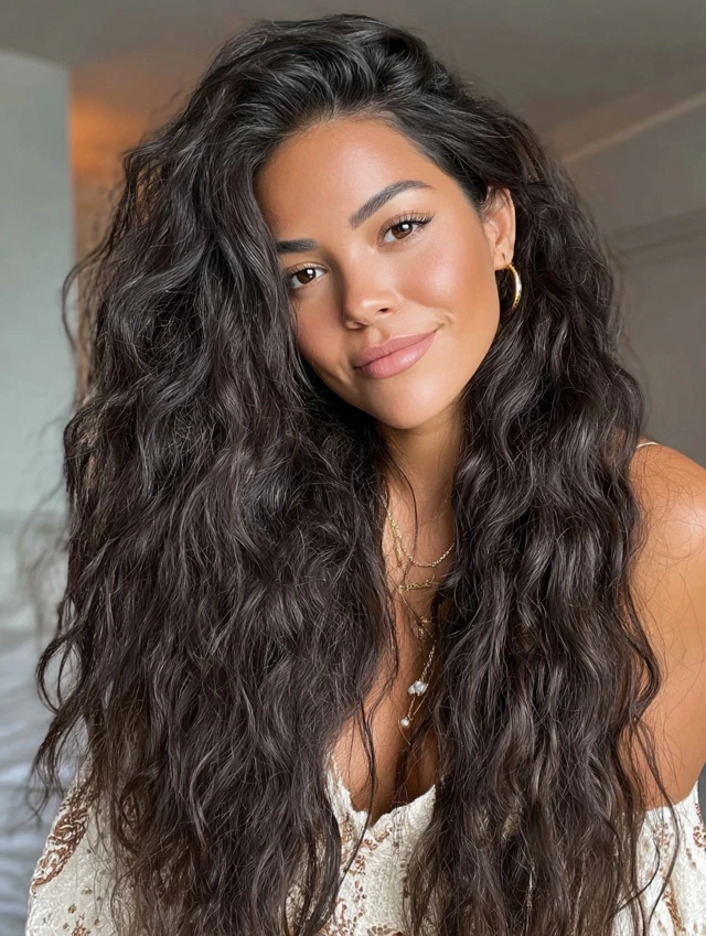 The middle part frames the face symmetrically while deep waves cascade beautifully for a soft, glamorous look.
