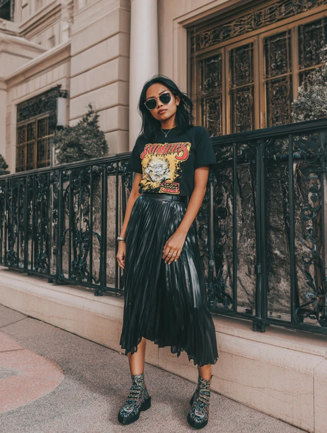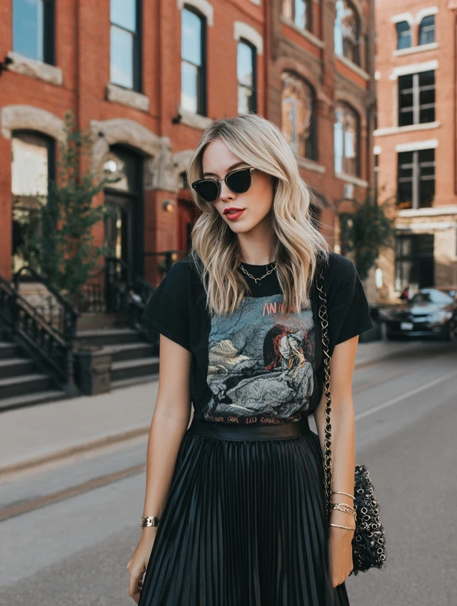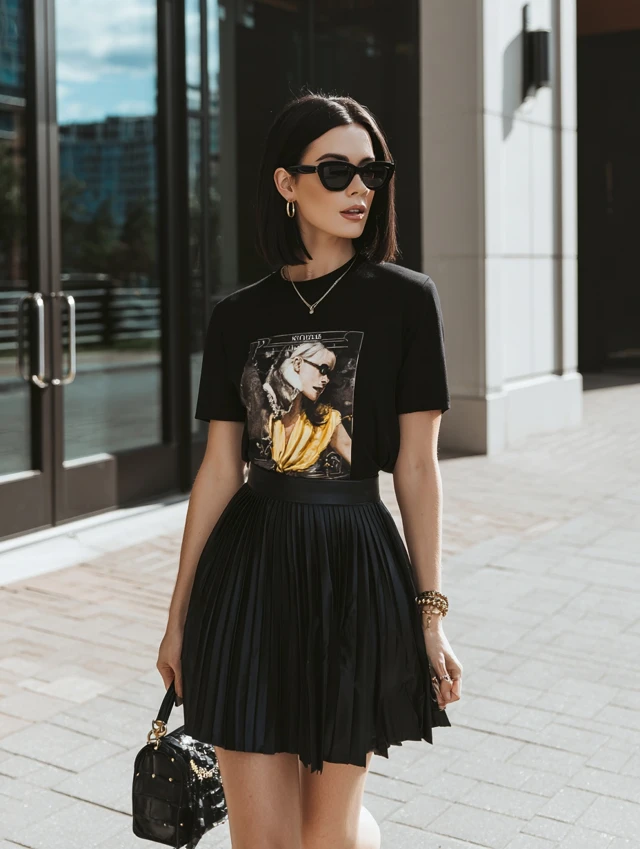 3. Black Pleated Skirt + Graphic Tee