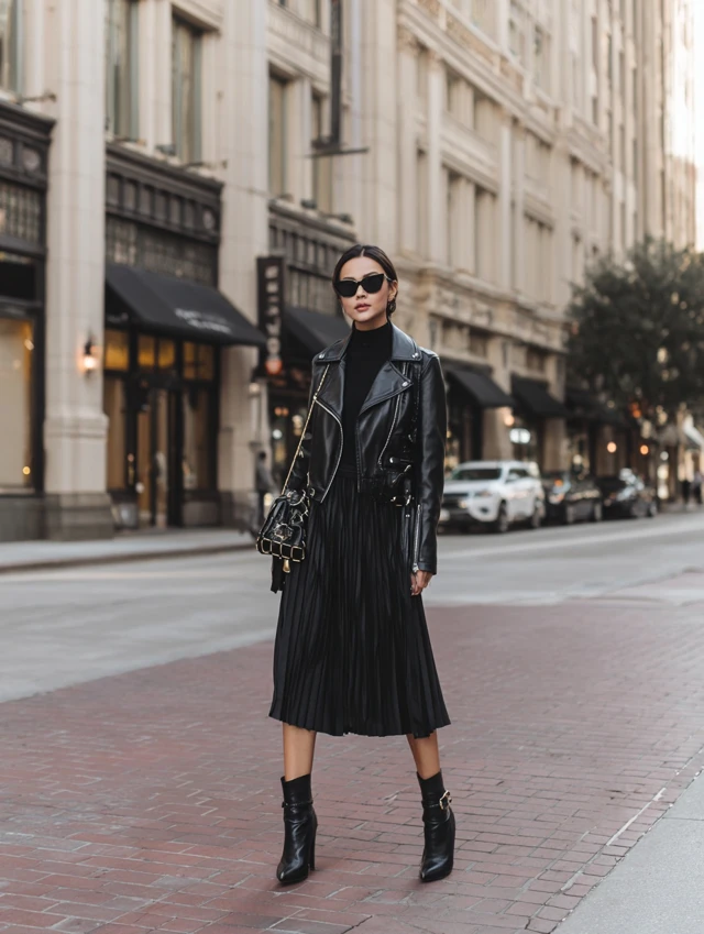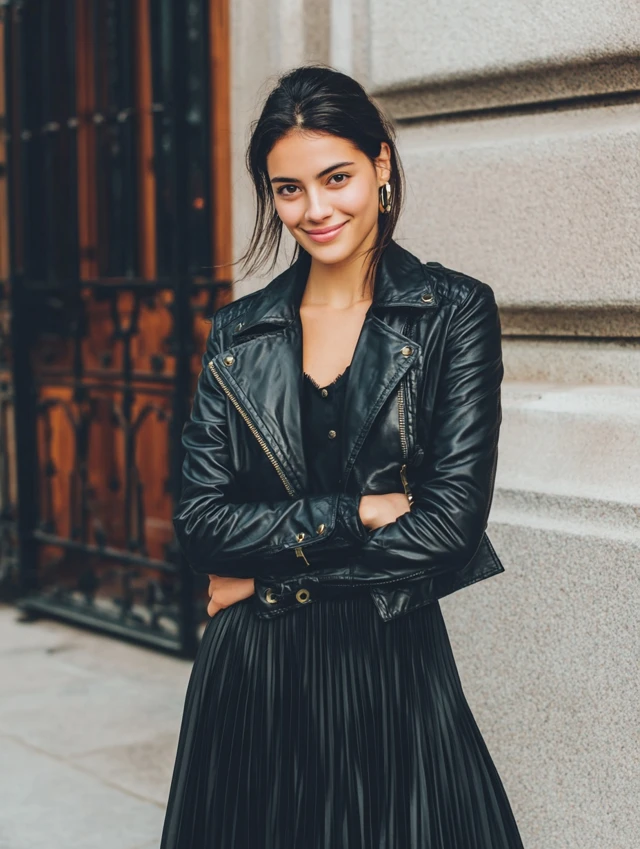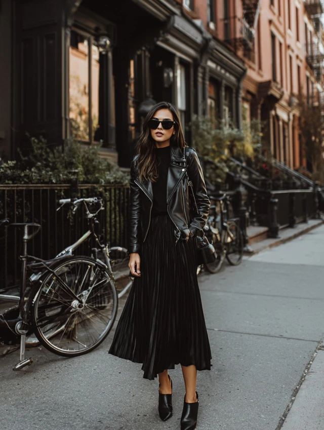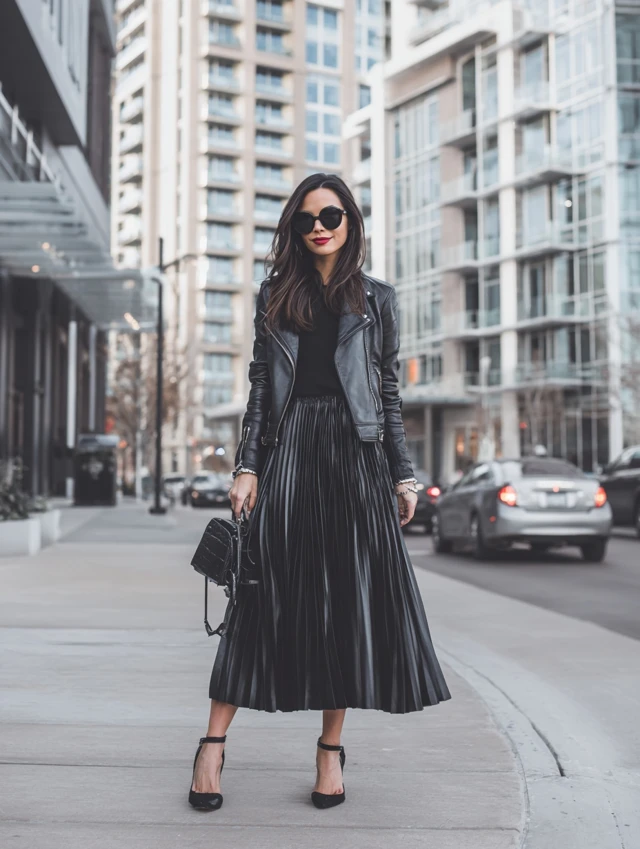 4. Black Pleated Skirt + Leather Jacket