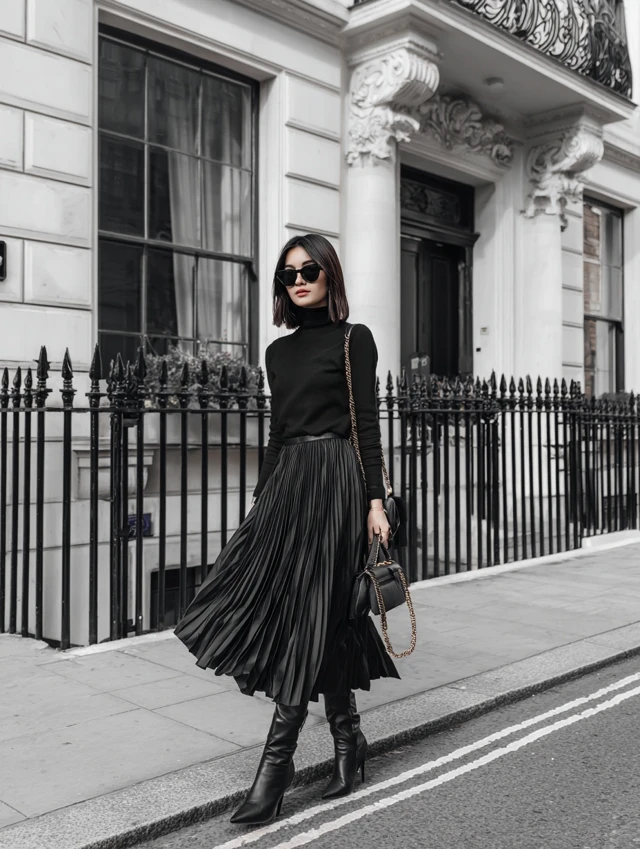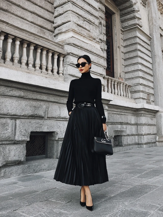 - Foundation: The black pleated skirt—midi or maxi length.