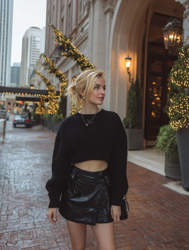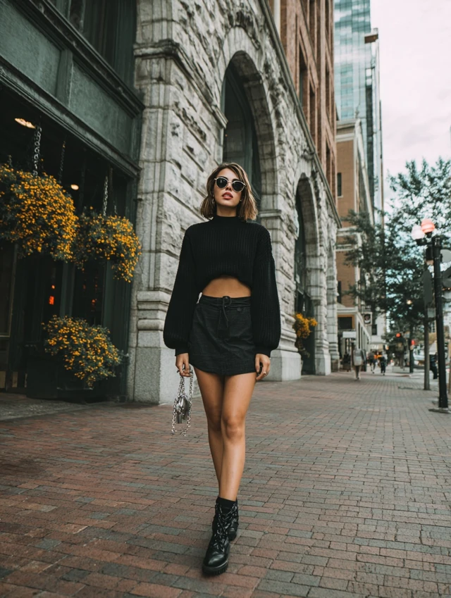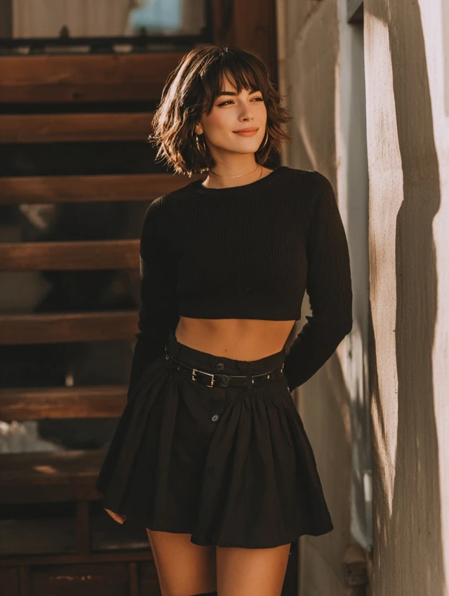 3. Cropped Black Sweater + High-Waisted Skirt
