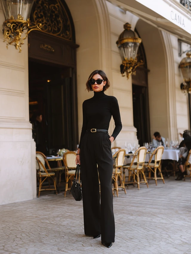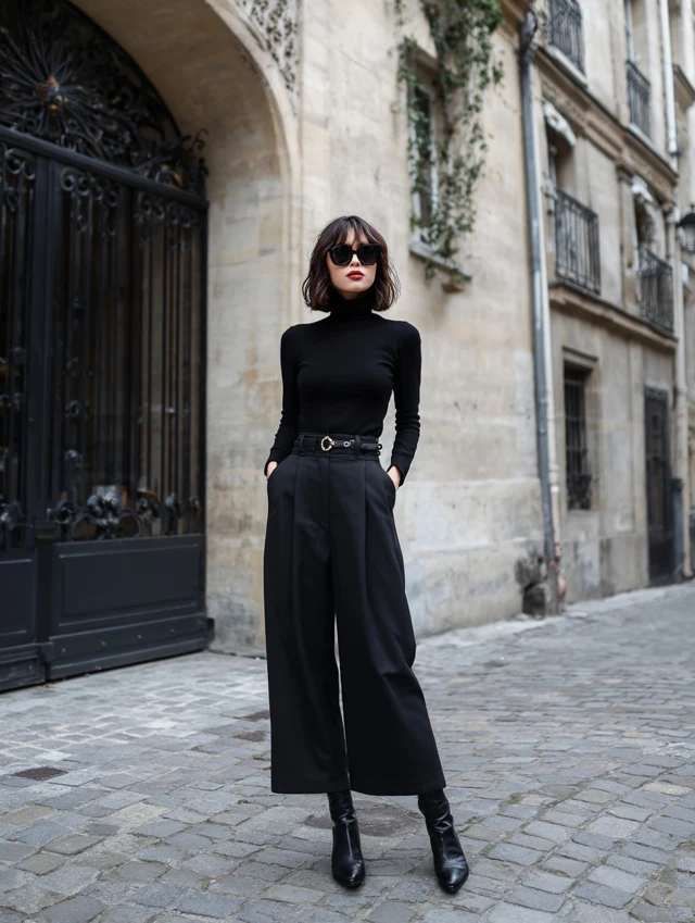 1. Black Turtleneck + Wide-Leg Trousers