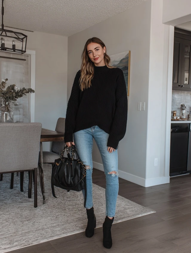 Creating stylish black sweater outfits is all about mixing balance and texture. Here’s the styling blueprint: