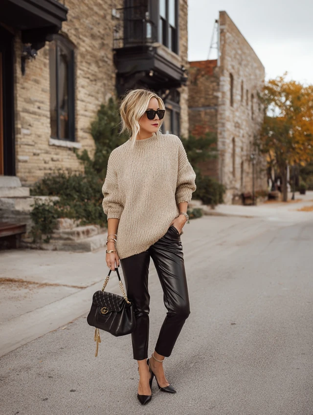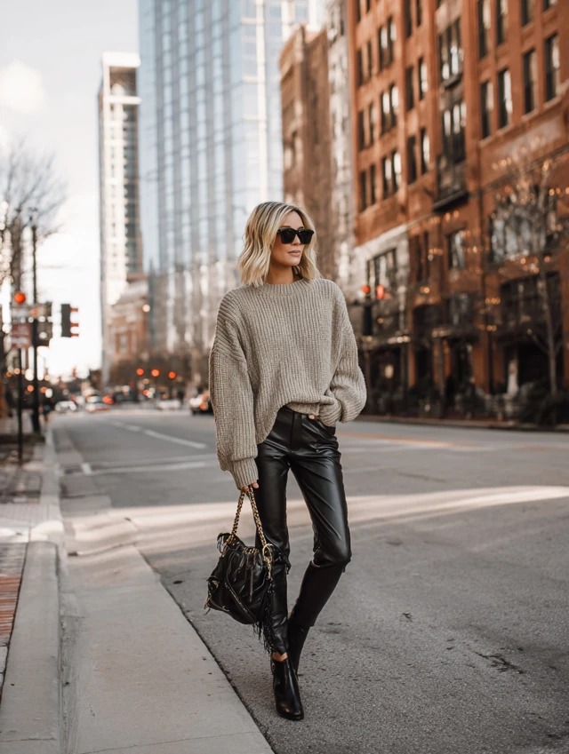 Why It Works: Cozy meets sleek. The contrast between soft knits and structured leather creates effortless balance.
