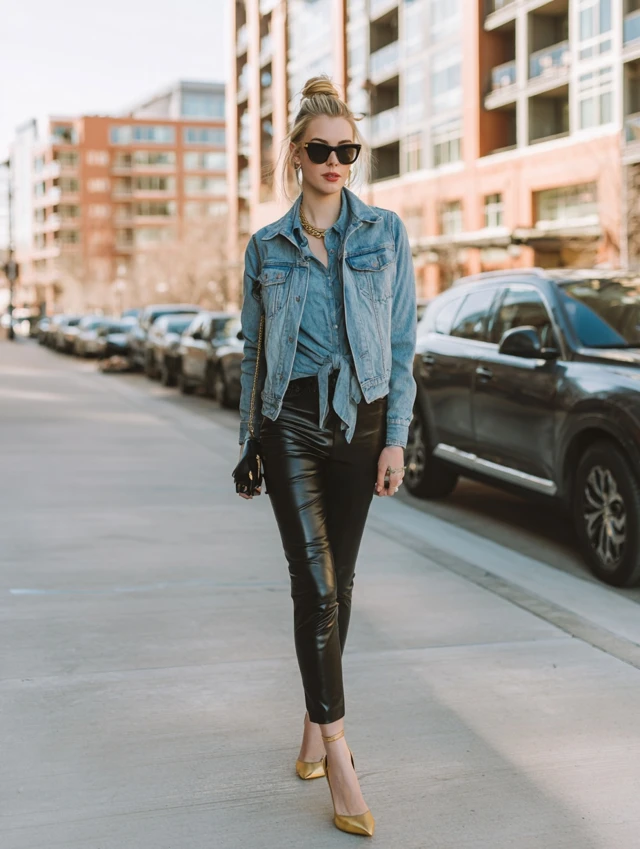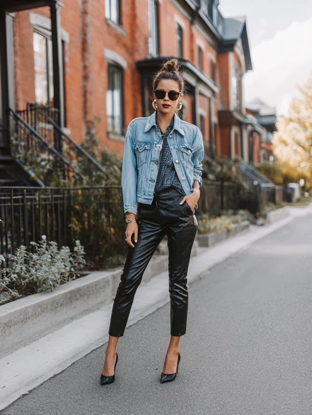 Why It Works: The rugged texture of denim softens leather’s edge, making the outfit effortlessly cool.