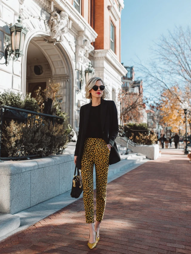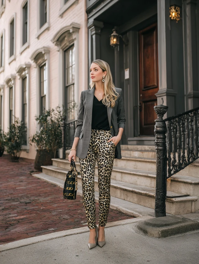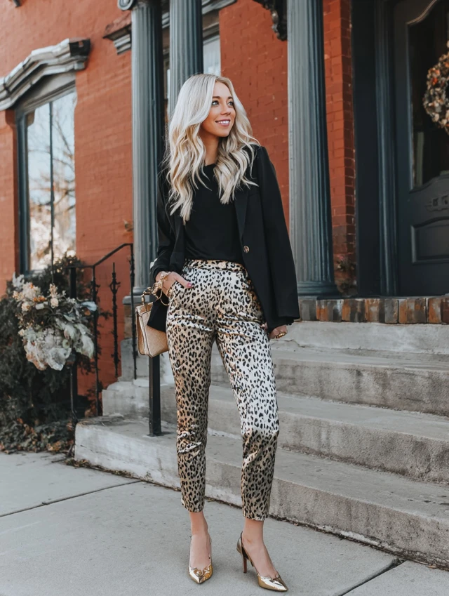 Leopard pants are all about attitude. The print is bold, so own it. Keep the rest of your outfit intentional—minimal but stylish accessories, polished footwear, and confident posture are key. Remember, the pants are the centerpiece—let them shine.
