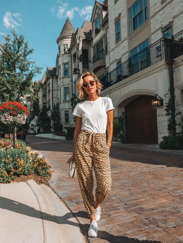 Leopard print is a neutral in disguise—it pairs beautifully with beige, black, and white, but also pops against red, pink, or denim. Textures matter too: silk leopard pants feel glam, while cotton or denim pairs scream casual chic.