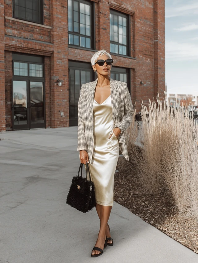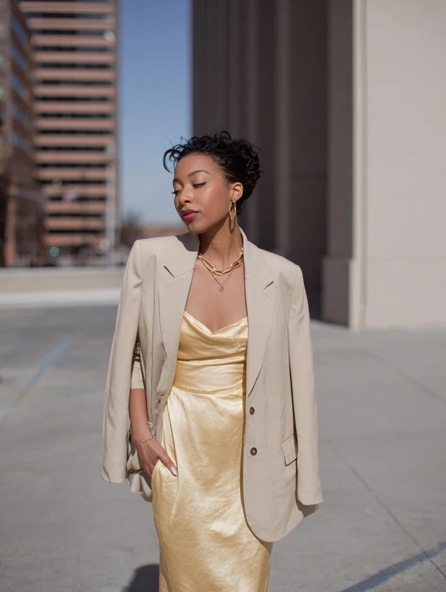 Why It Works: The elegance of satin with the structure of a blazer makes a power duo.