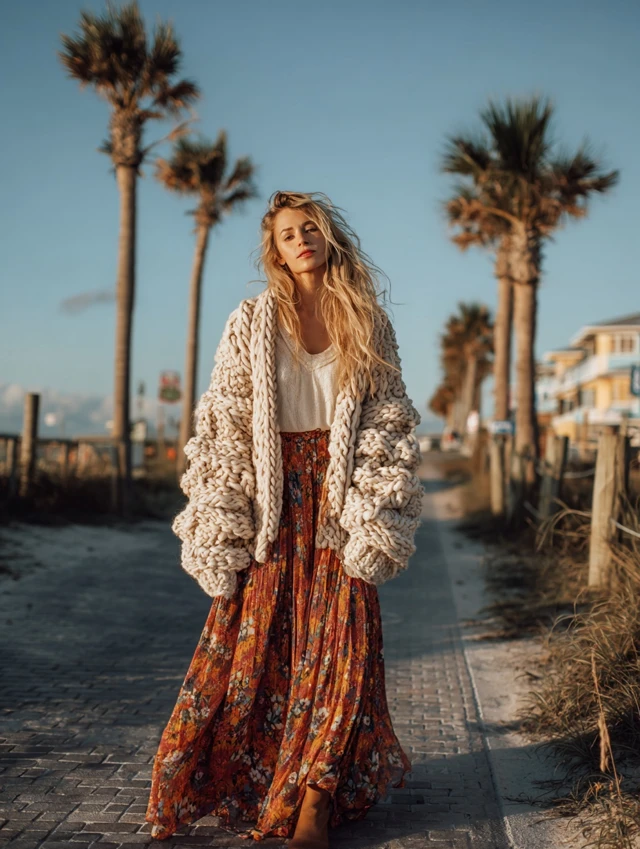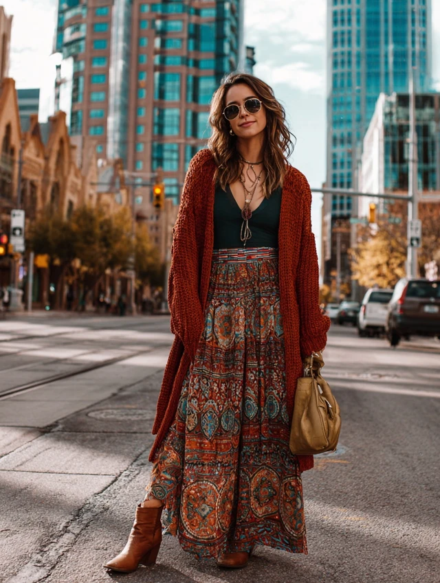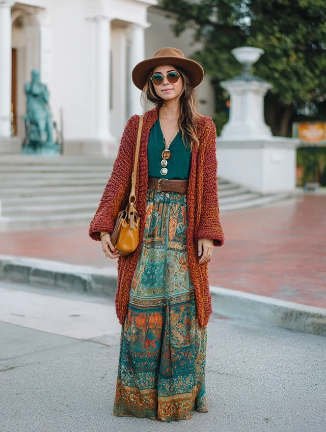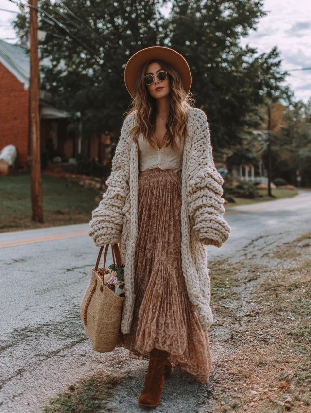 Why It Works: Flowing boho dresses pair perfectly with cozy knits for effortless style.
