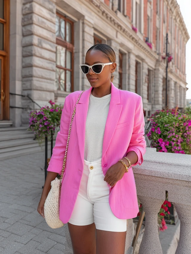 Wearing a pink blazer isn’t just about the outfit—it’s about the vibe. Own the boldness of the color. Pair it with intention. A simple base outfit instantly transforms into a statement look when topped with a pink blazer and styled with confidence.