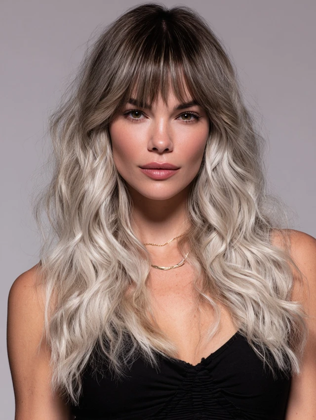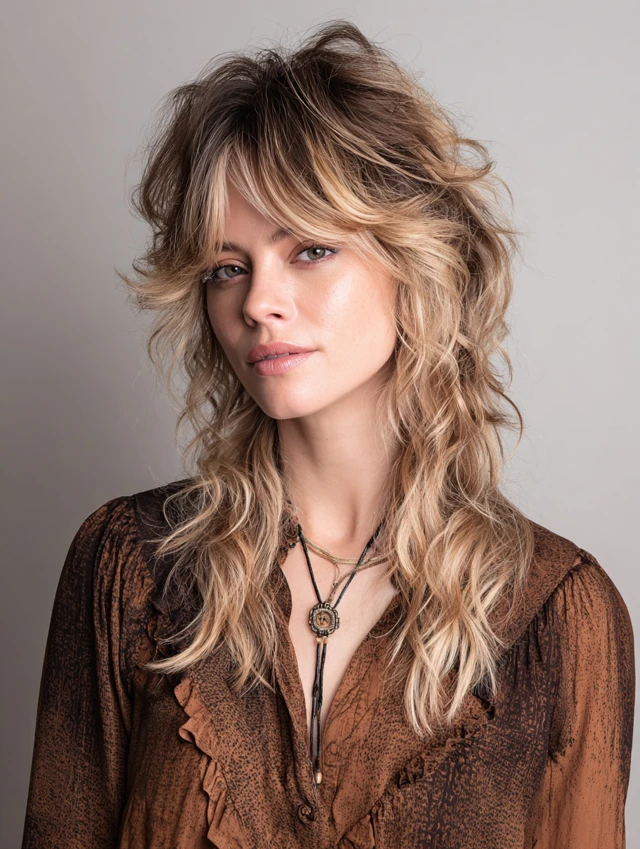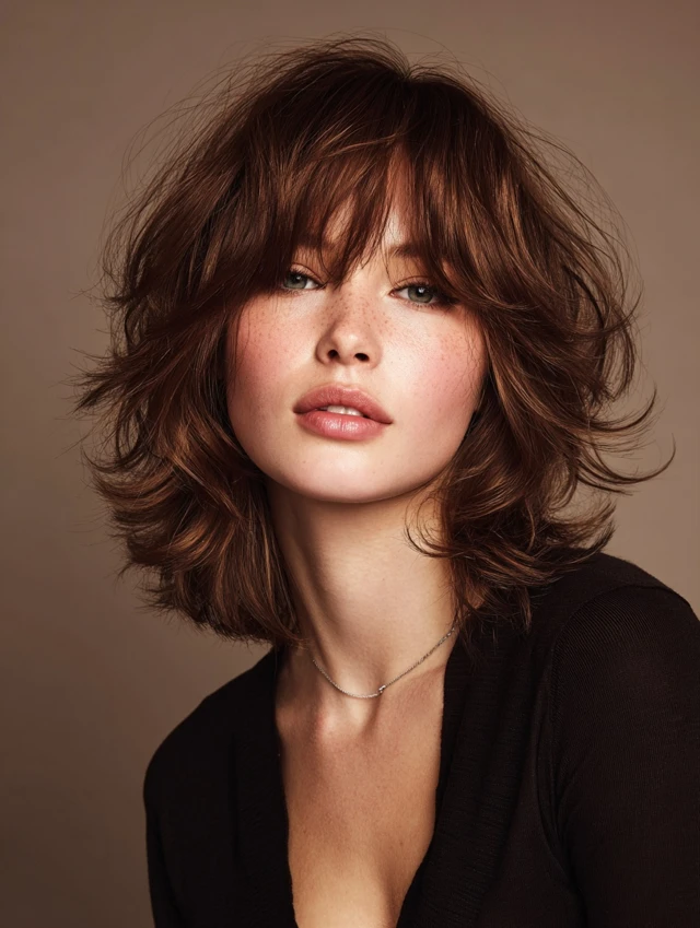 Wispy bangs soften the face and blend beautifully with the tousled layers.